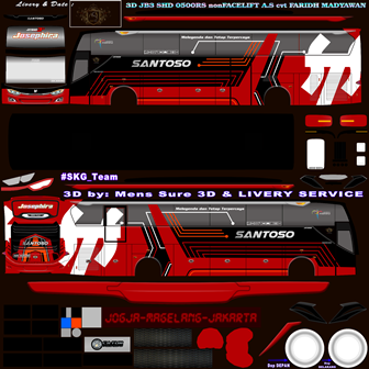 Salah satu livery yang paling banyak dicari oleh pemain Bussid adalah Santoso. Kali ini admin akan berbagi livery Santoso JB3+ dengan warna livery hitan dan striping merah putih. Livery ini menurut mimin paling keren di antara livery Santoso yang lain seperti yang warnanya putih.